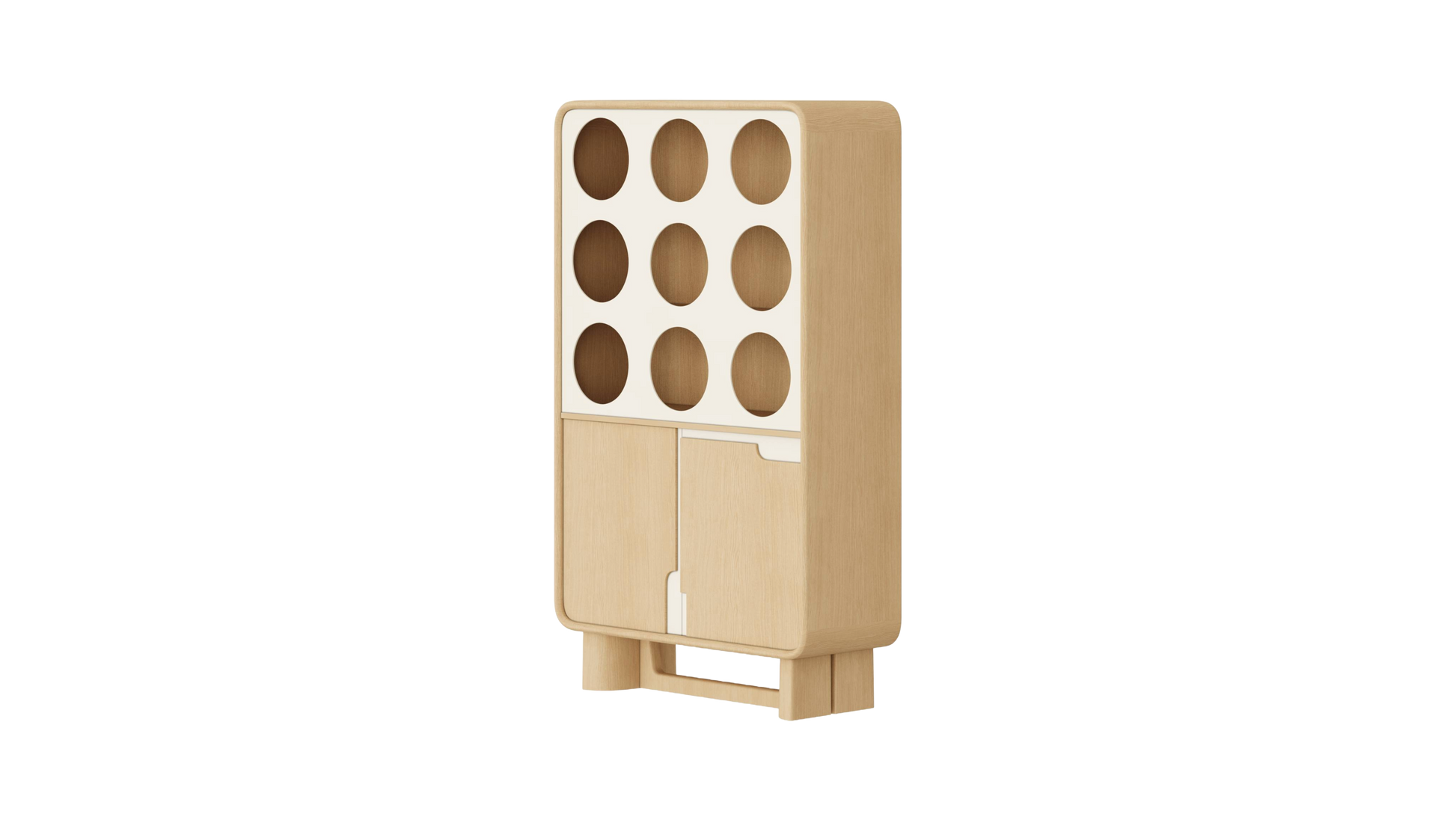 Organize with a touch of modern flair with the Honeycomb Cabinet. Featuring distinctive circular compartments reminiscent of a natural honeycomb, this unit offers a stylish and accessible storage solution for a variety of items. The sleek light wood finish and clean lines are complemented by the practical closed cabinets below, showcasing thoughtful design and quality craftsmanship.