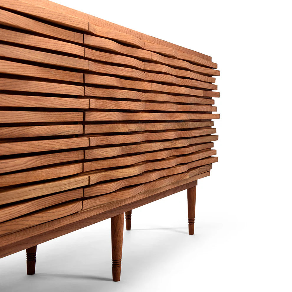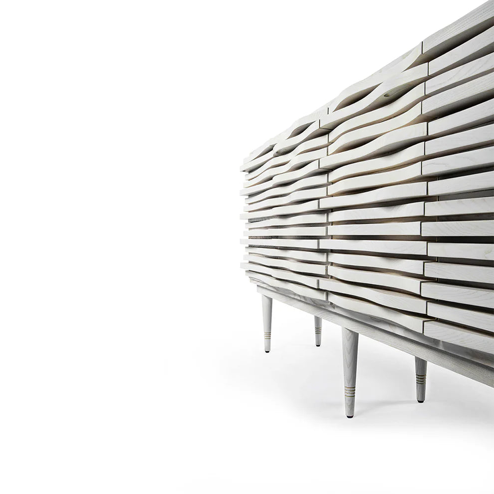 The wayve console bridges the gap between the straight line by adding a modern, sculptural quality to this storage unit. Each segment has been delicately carved out of reclaimed solid wood to ensure minimum wastage. The pieces are then stacked together to create the unique facade. A functional piece that is inspired by the waves of the ocean, this console is a piece of art that will enhance any home.