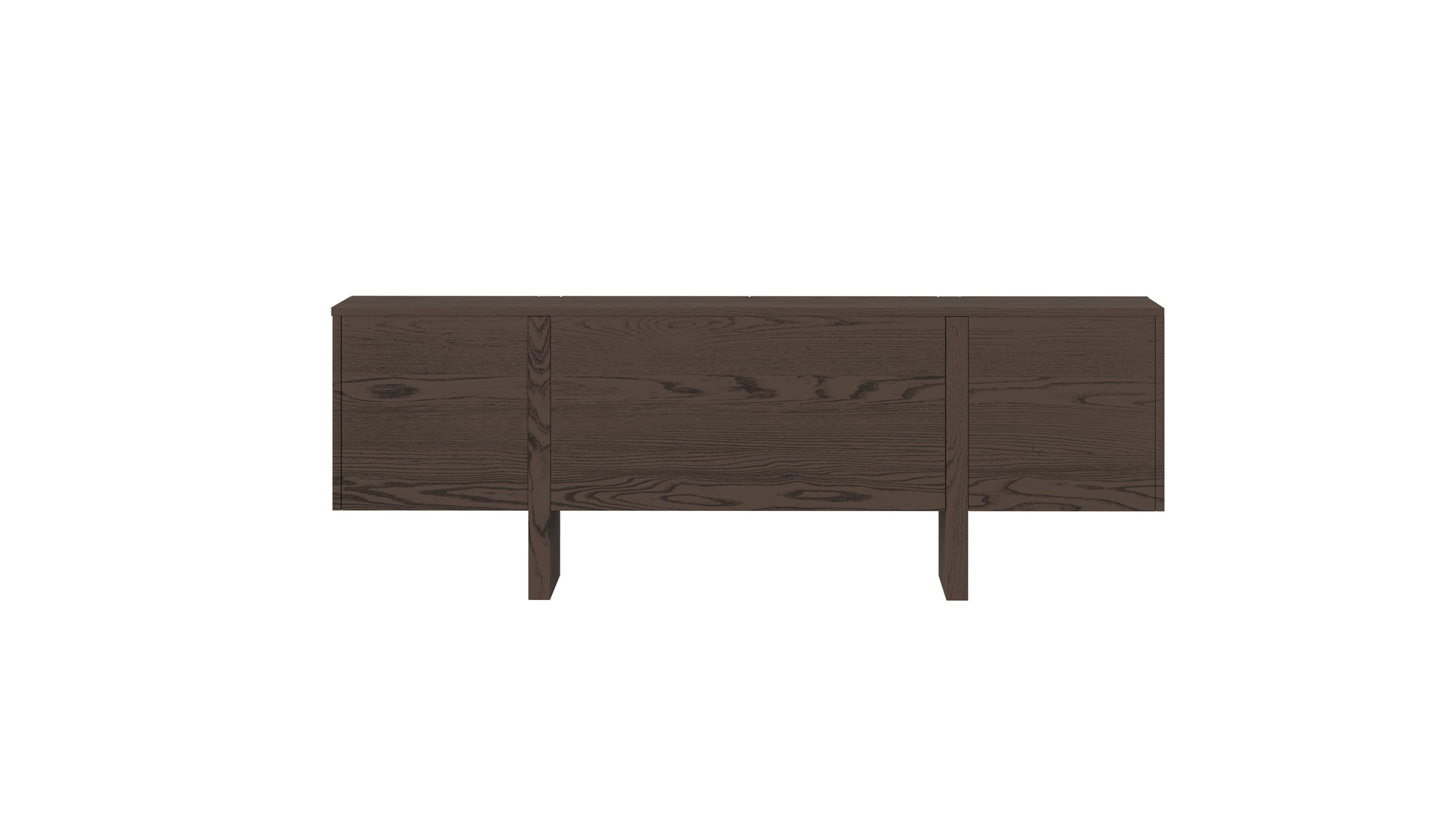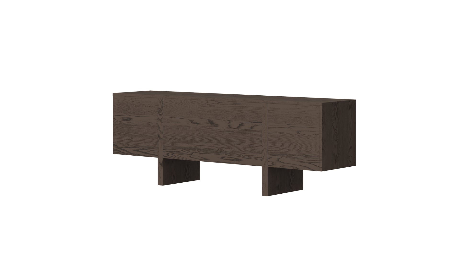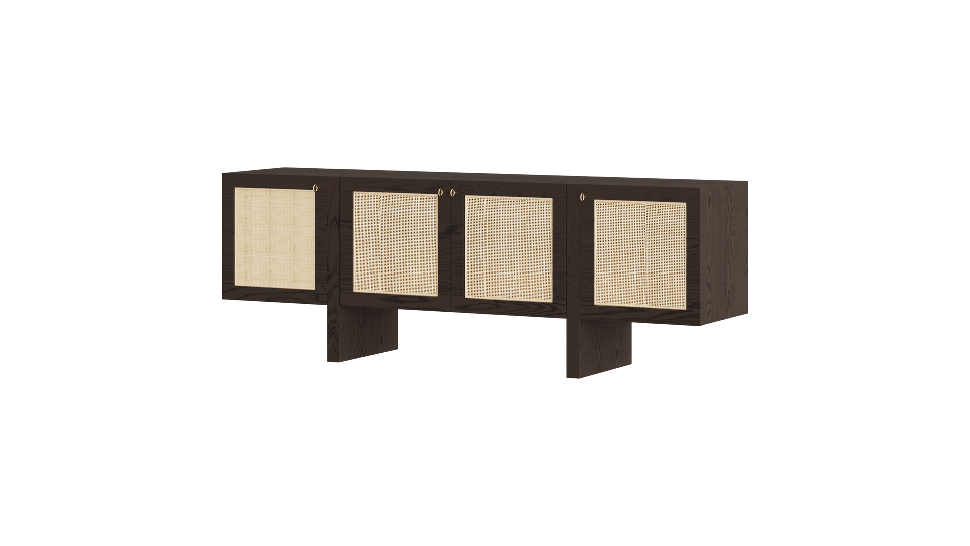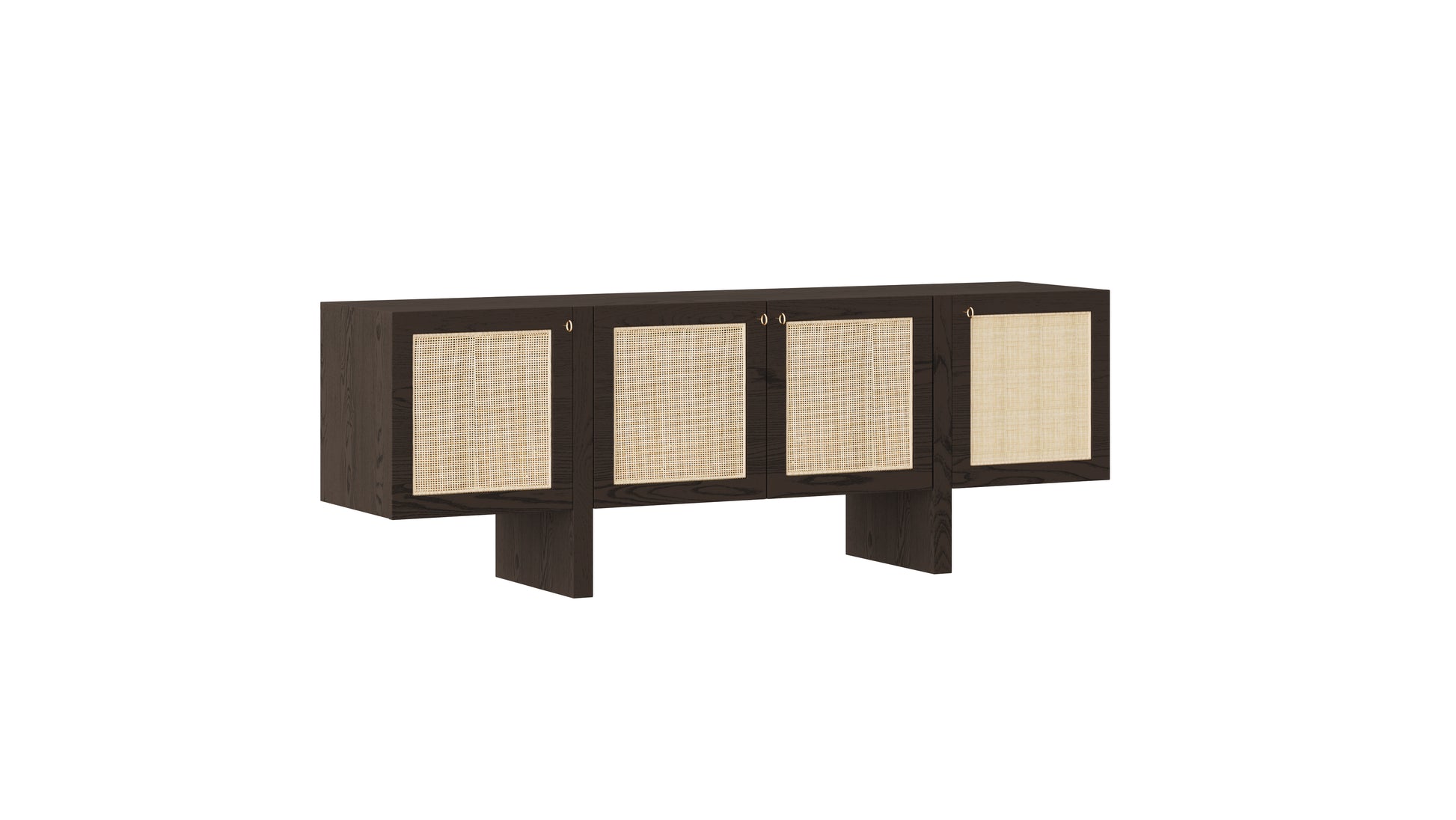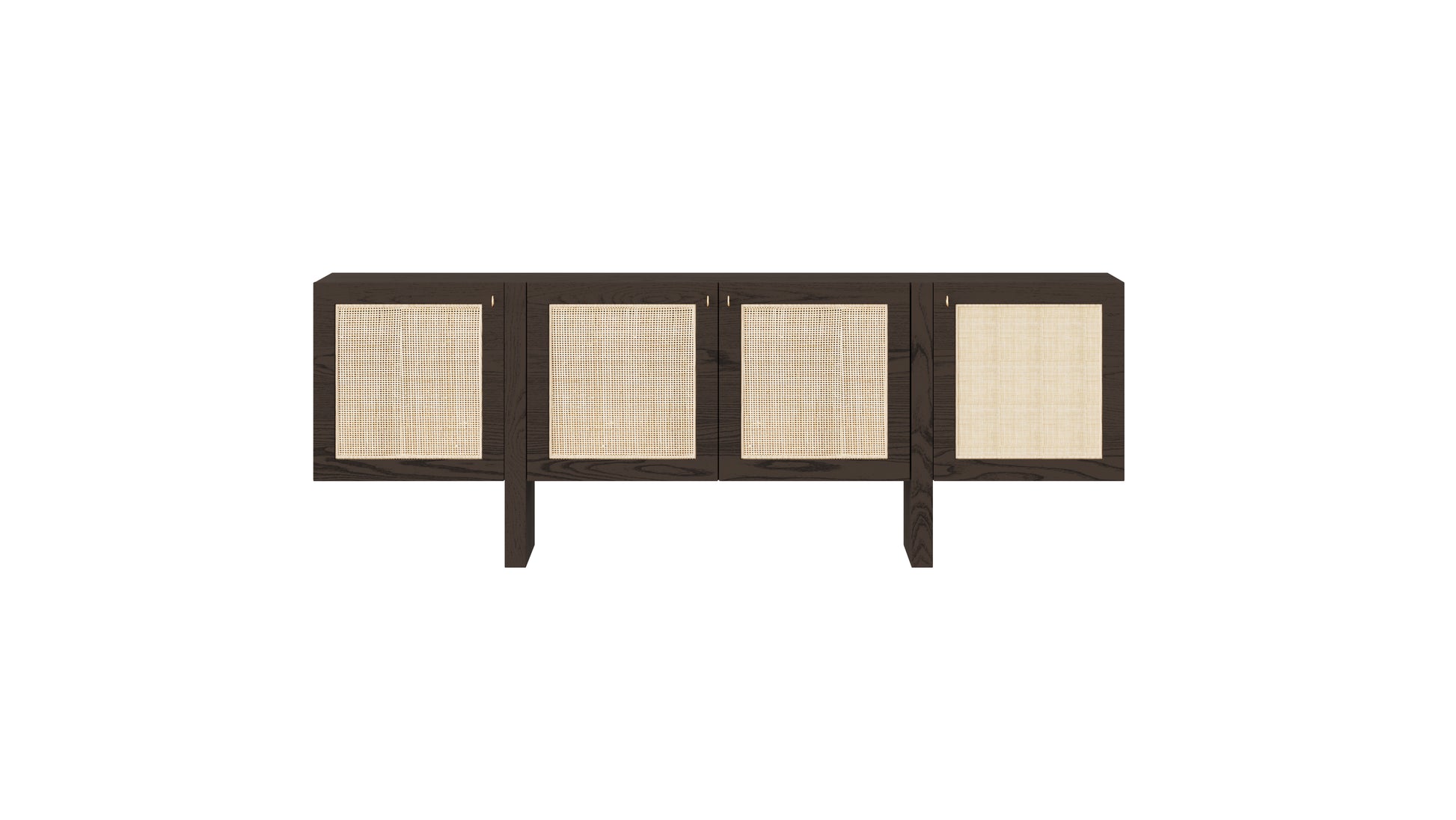 This appears to be a "Zen TV unit" in a mid-century style. It's a black and rattan sideboard, possibly identified as a "Four Hands Goldie Media Console". The unit features a dark wooden frame and four cabinet doors with light-colored rattan panels. It is supported by two solid wooden structures that act as legs.